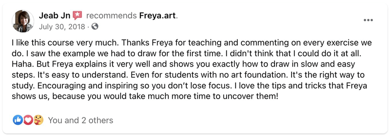 In addition to that, you also join our private Facebook group. In this group you’ll be able to share your work and let me and the other students give you constructive feedback. See the most common mistakes others make and learn how to avoid them yourself. If we learn together, we learn faster.